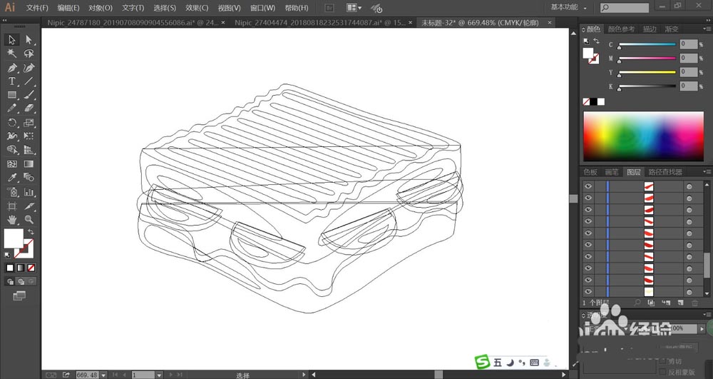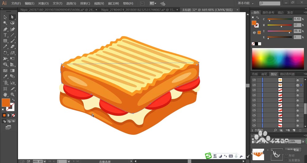 1、先用钢笔画出面包的结构,上面的面包片的三个侧面与下方面包片的两个侧面,中间的肉片细节路径都一一绘制出来,再画出面包顶端的图案细节元素路径。