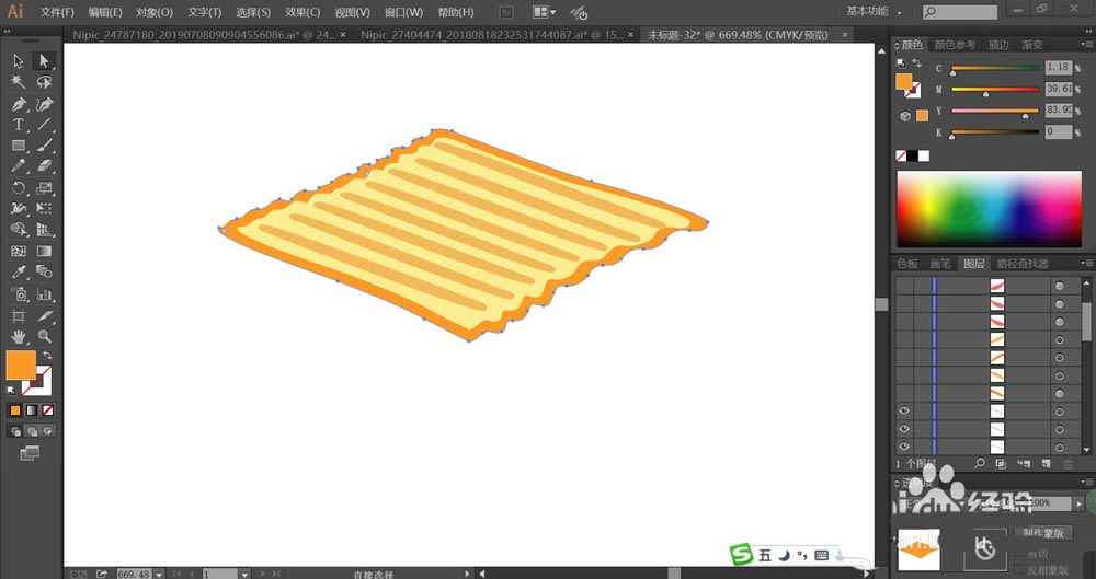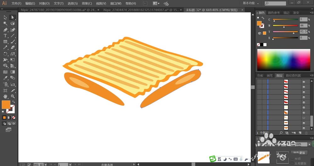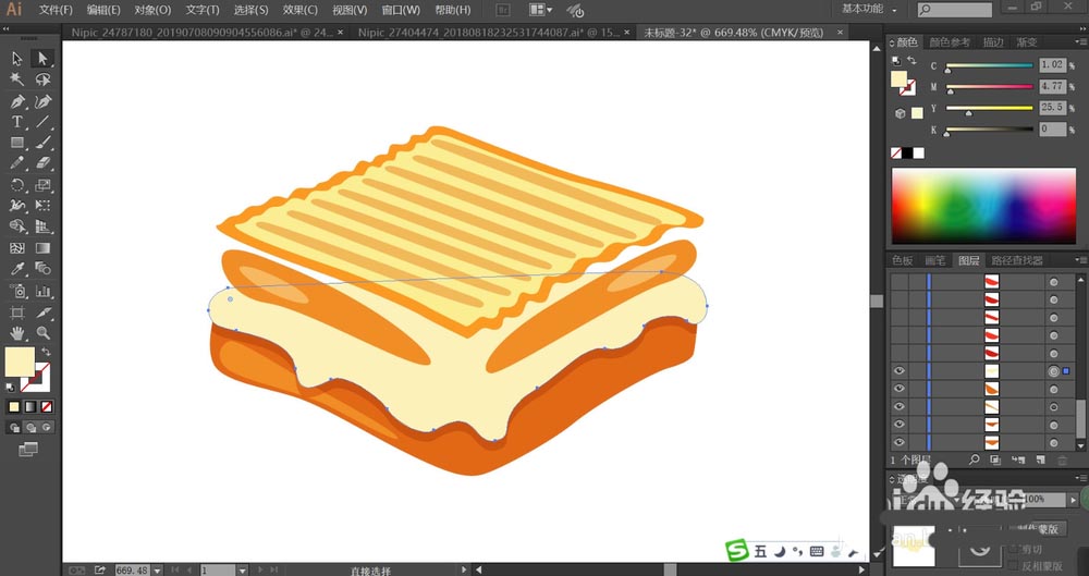 2、用橙黄色、黄色、褐色分别填充上层面包片的顶端,让其图案与色调完全呈现出来。