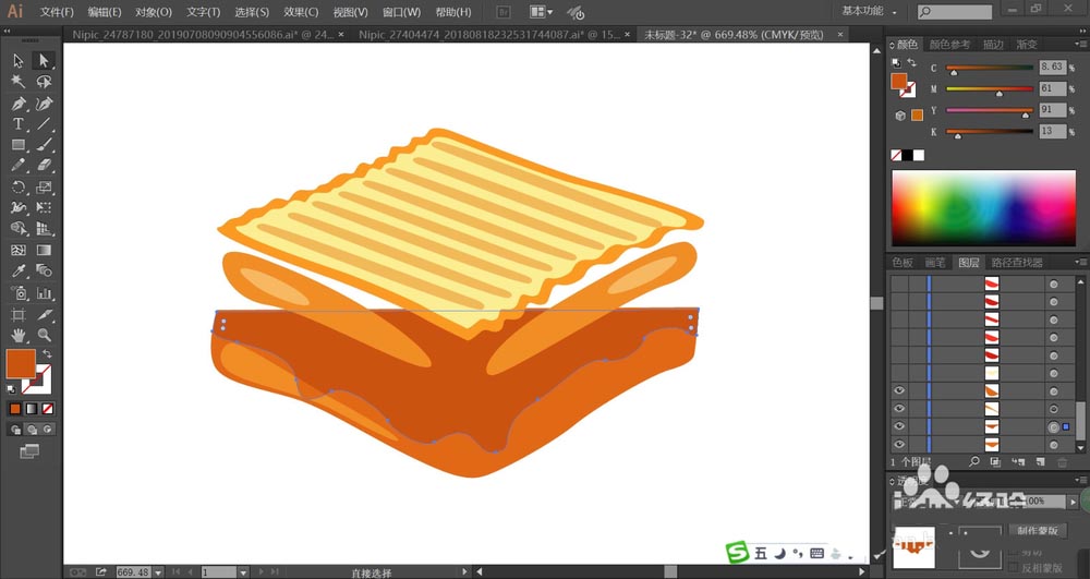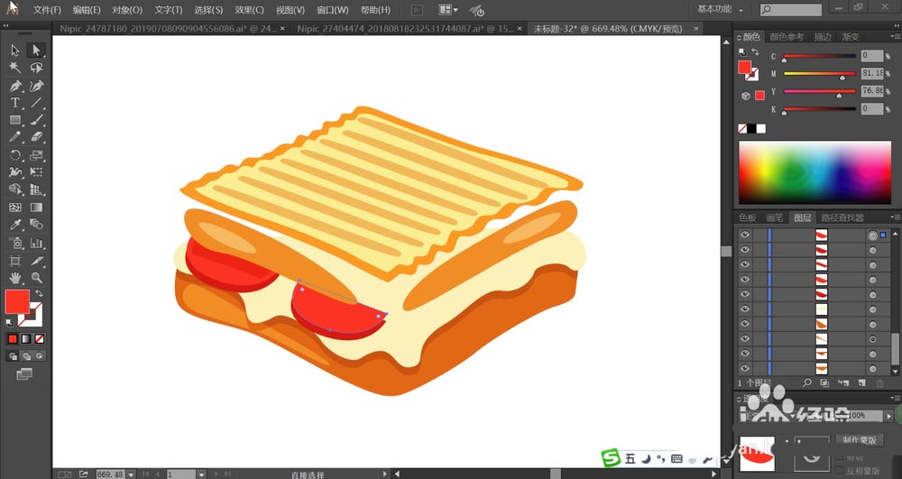 7、使用两种不同的红色填充所有的红色肉块,再用暗橙色填充上层面包片的下方暗光区域,完成夹心面包图片设计。