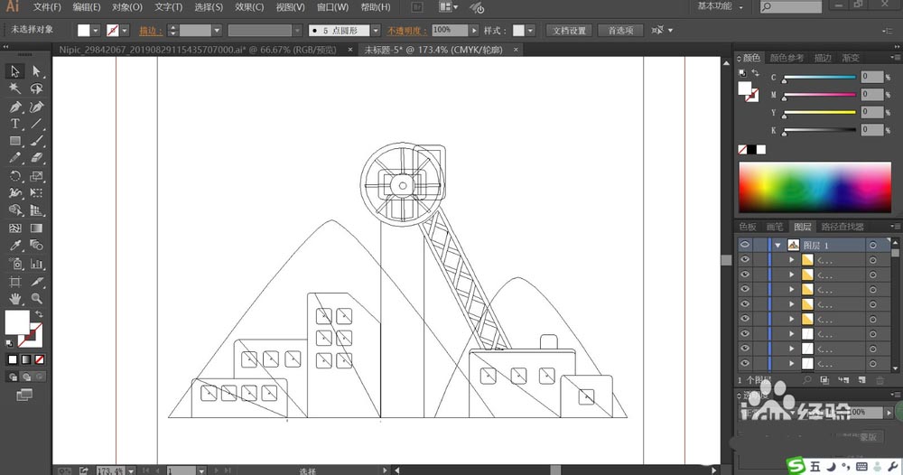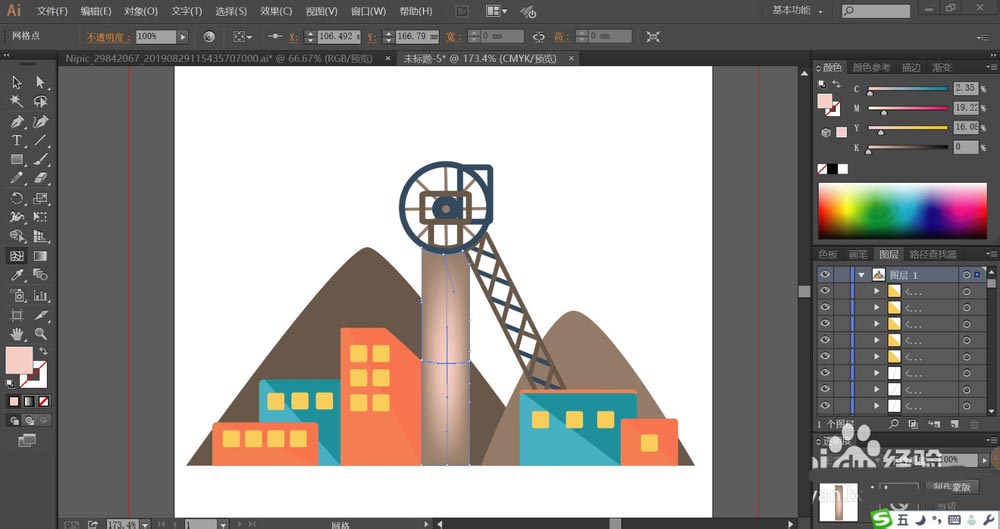 1、使用钢笔工具画出三角形的矿山形状,再用圆形工具与钢笔工具画出大型的机械的细节结构,再使用矩形画出工地上的房屋与窗户的路径。