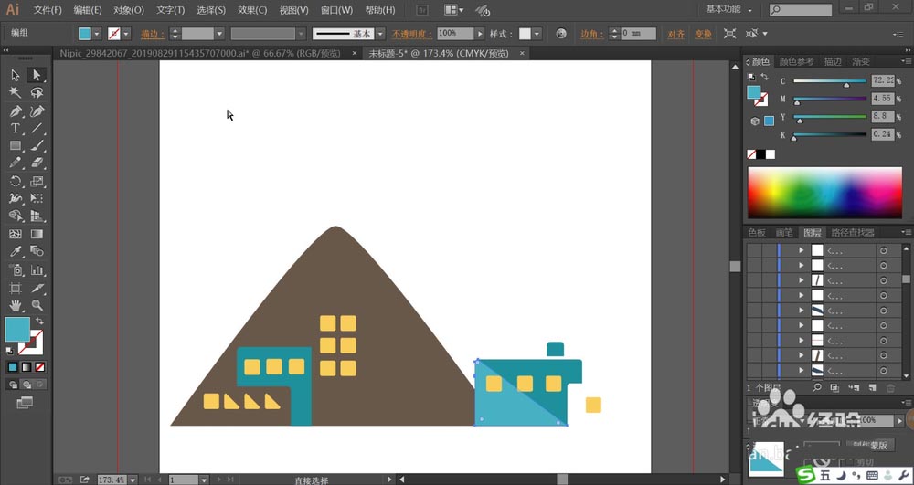3、转换背景色到前景色,我们用青色填充房屋所在的路径,稍稍调整一下青色的亮度,我们用明暗两种不同的青色填充房屋的高光与暗光的区域。大山用棕色来填充。
