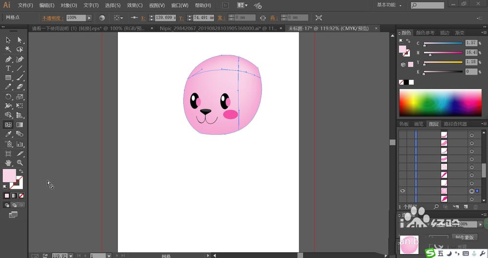 3、接着,我们用梅红色填充小熊脸蛋上面的红晕,再使用网格工具点击一下小熊的脸蛋,让其呈现一个桃红色的渐变效果。高光在额头位置。