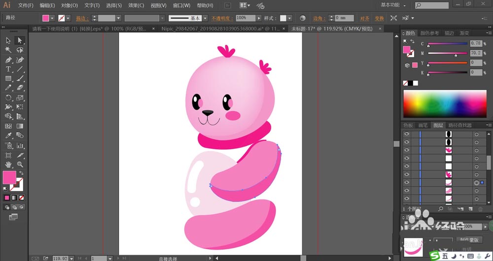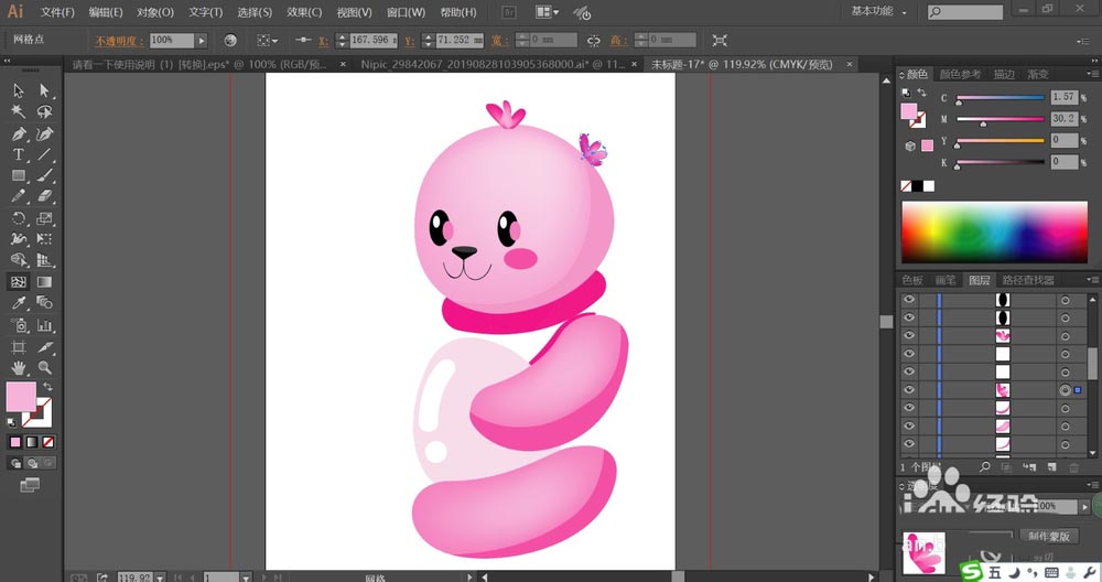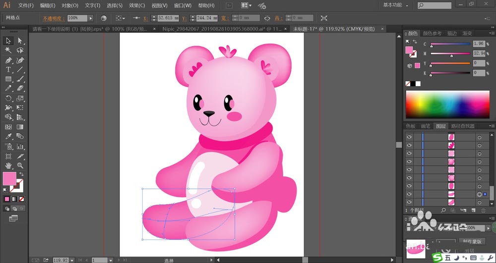 7、最后,我们用梅红色与桃红色填充小熊的耳朵内外侧,再用网格工具做出一个梅红色的渐变效果,结束小熊的四肢的填色,完成粉色小熊玩具设计。