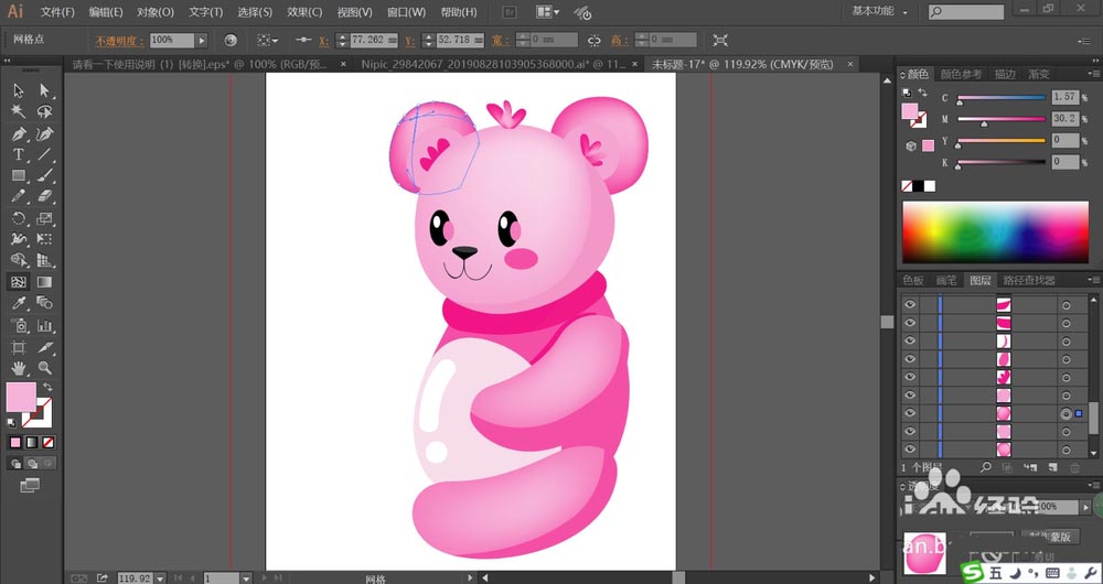 6、用梅红色填充小熊头上两侧的装饰品,再用网格工具点击小熊的四肢让其呈现粉红色的渐变效果。