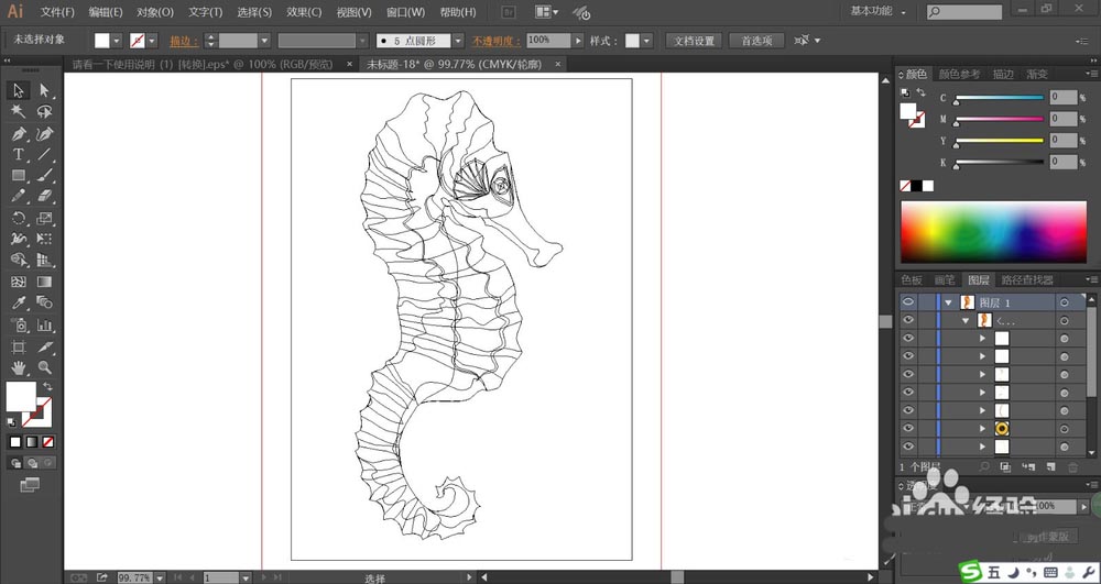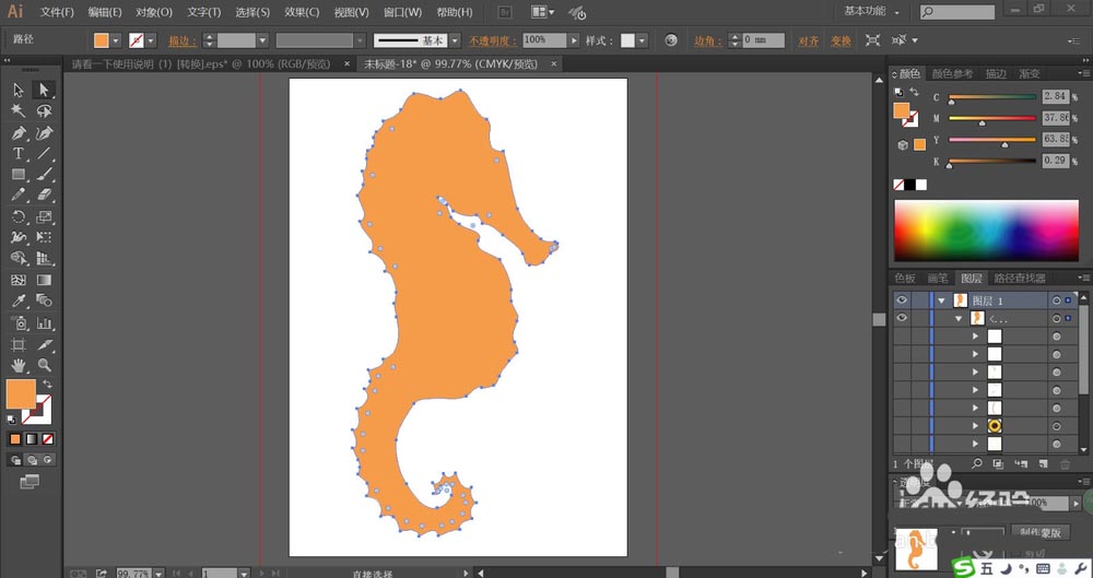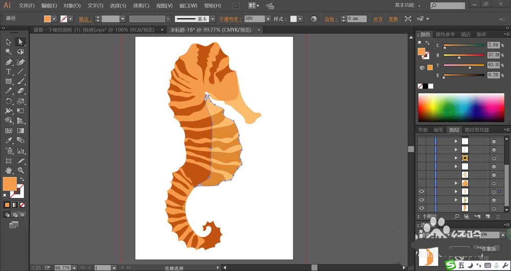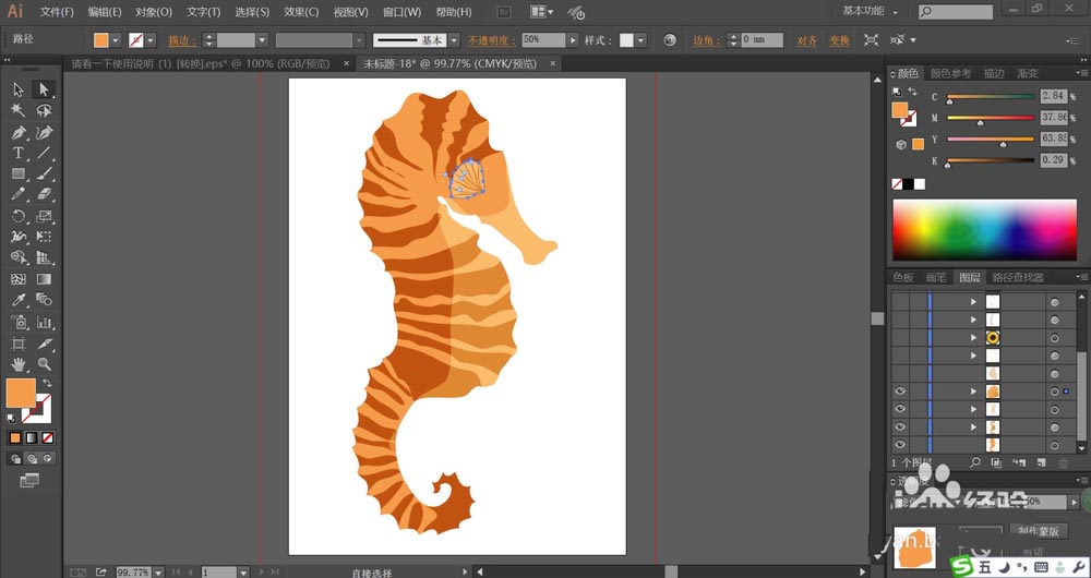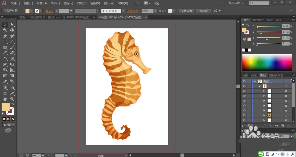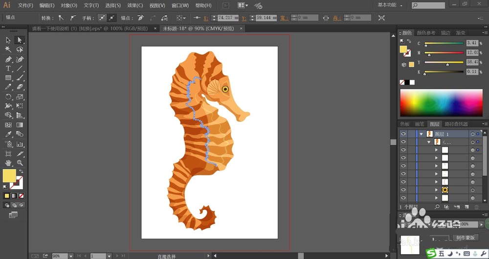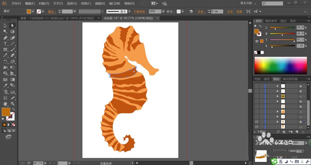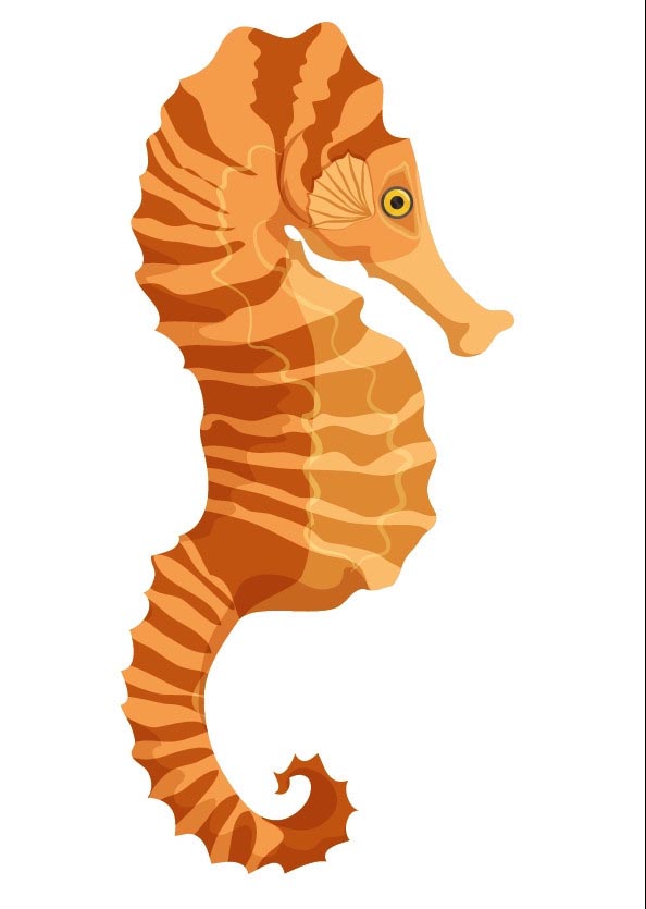 7、最后,我们用黄色填充海马身上正面的高光线条,再使用网格工具点击一下海马的身体做出淡棕色的渐变效果,完成海马图片设计。