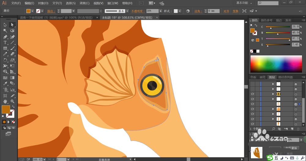 5、接着,我们来画了海马的额头上的圆弧花纹,分别用黄灰色填充底部,用土黄色填充内部的线条。海马的眼晴外围用黄色填充,再用正片叠底模式的土黄色填充内部来加强暗光效果,眼晴本身用灰黑色与黄色搭配填充,制作一个高光效果在瞳孔上面,我们用滤色模式的黄色填充,透明度为20%左右。
