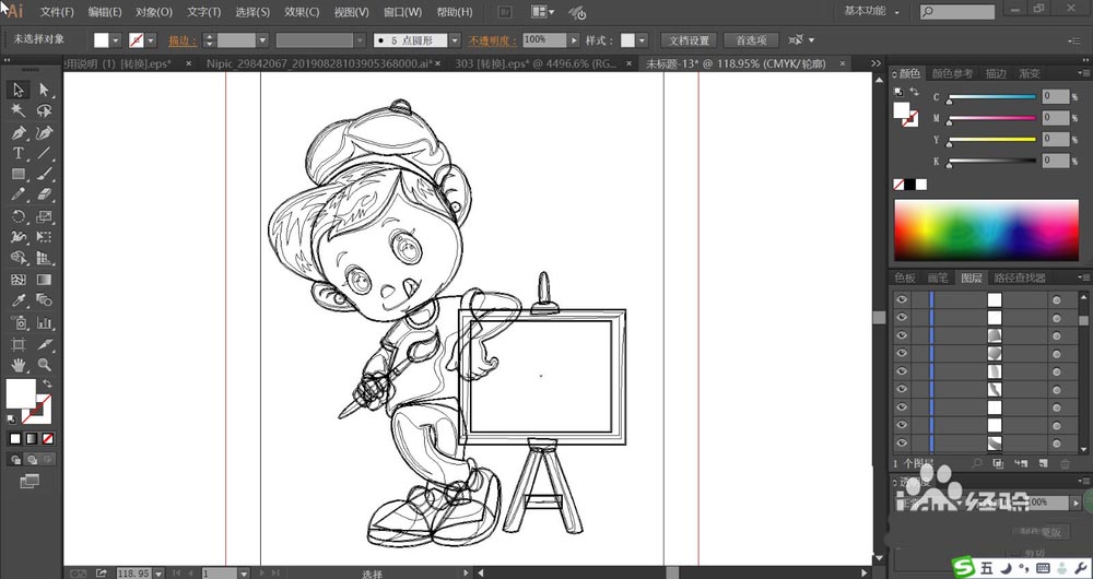 1、先用钢笔画出小画家的基本轮廓,我们重点绘制小画家的头发、眼晴、服饰、画笔与画架,还有双手与双腿的动作轮廓。