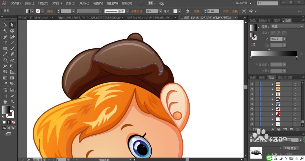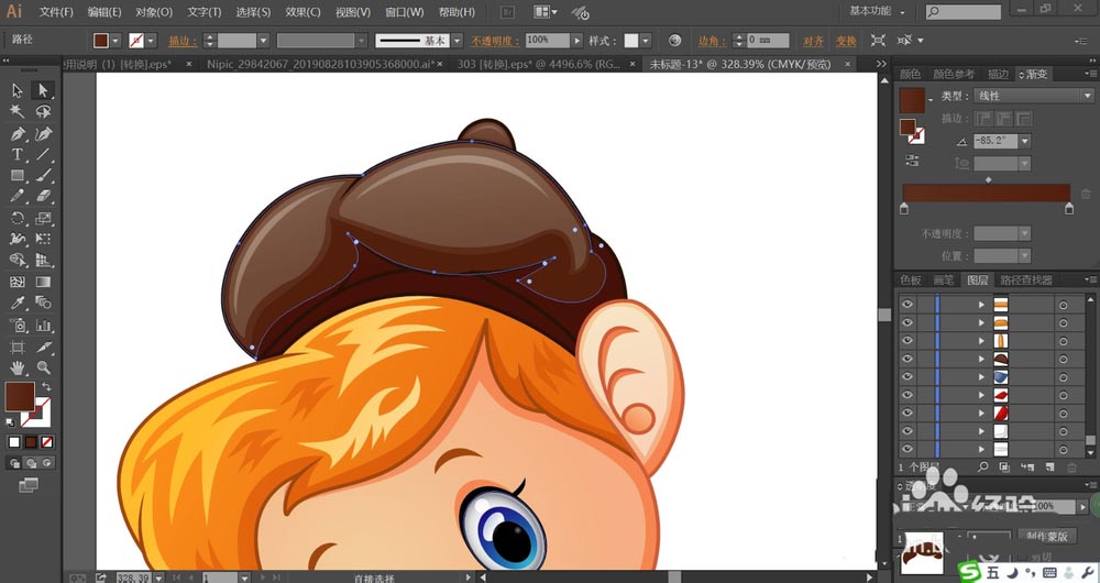 2、用深棕色的渐变填充帽子,再用正片叠底的渐变色填充帽子上面的高光区域,透明度为30%左右。