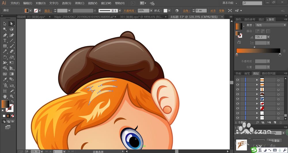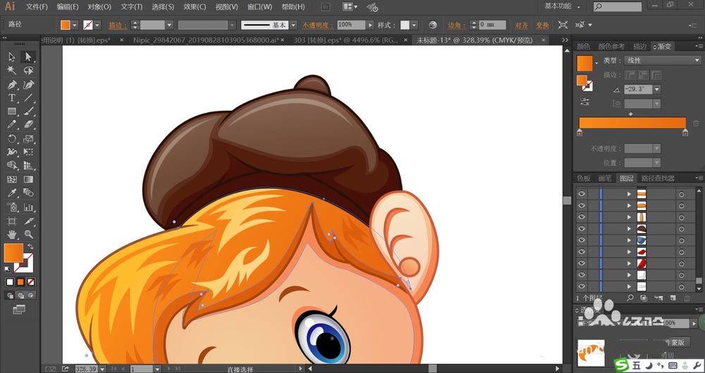 3、接着,我们用粉色的渐变填充脸蛋,再用橙黄色填充头发,头发的高光用滤色模式的橙黄色渐变填充。头发的暗光区域用暗橙色的渐变填充。