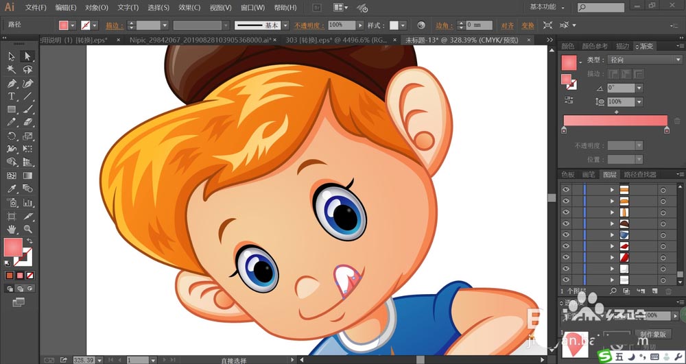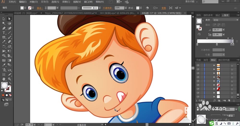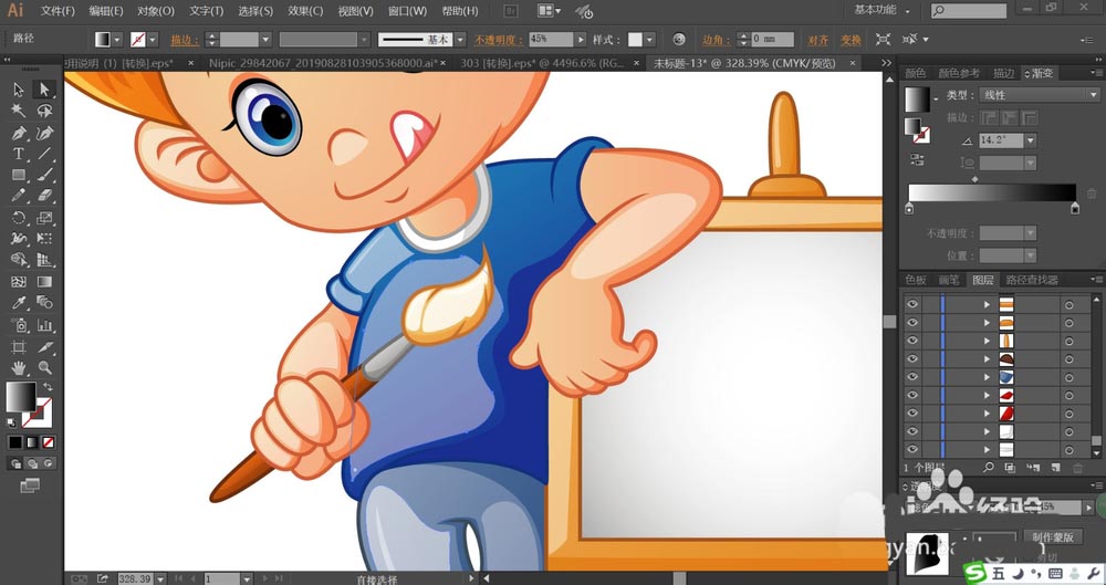 8、小朋友的裤子用淡蓝色的渐变填充,裤子的高光区域用55%的滤色模式的渐变填充。
