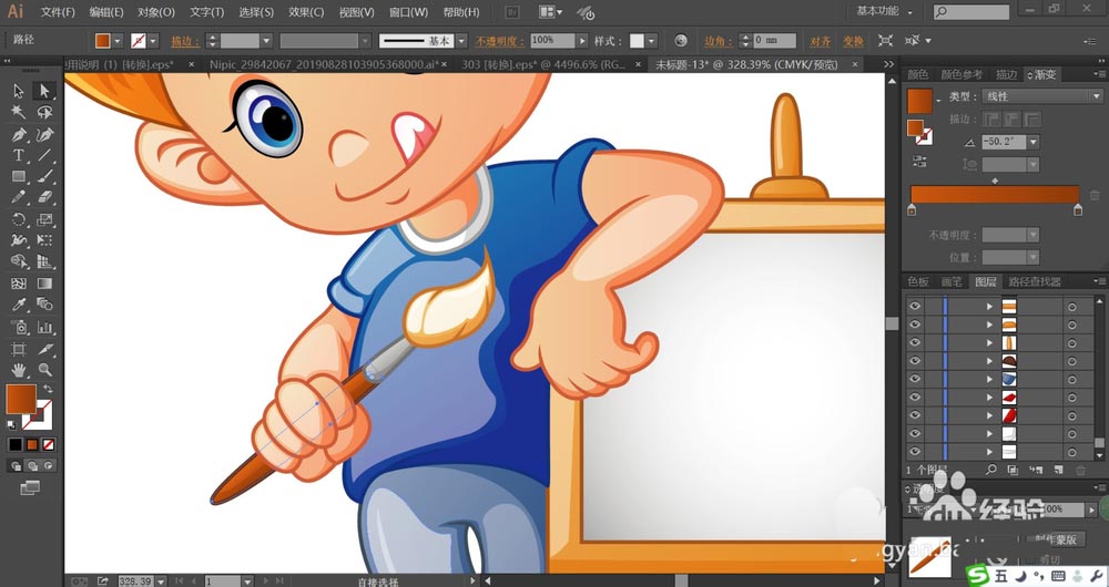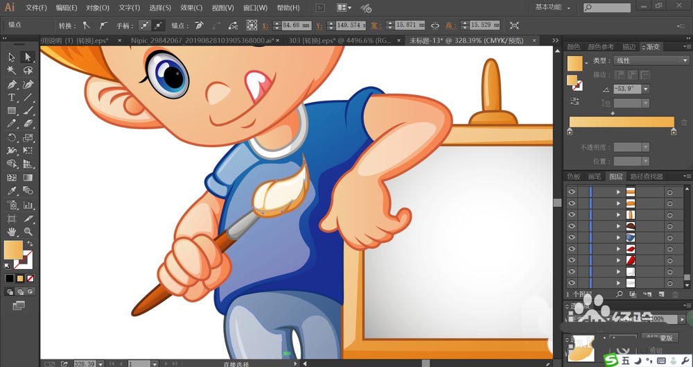 6、小朋友手里的画笔用橙黄色的渐变填充毛刷,用褐色的渐变填充画笔杆,手臂用粉色的渐变填充,给画笔与手臂都做出高光效果,方法与之前一样。