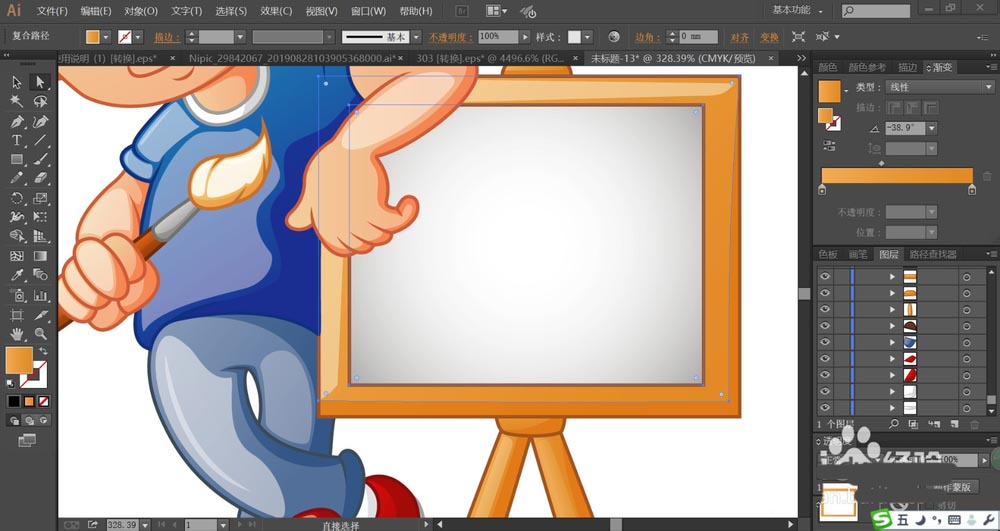7、接着,我们用灰白色的渐变与橙黄色的渐变搭配填充画架,画架的高光区域在左下方位置。