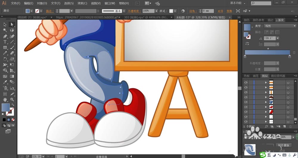 9、最后,我们画出小朋友的鞋子,分别用红色的渐变填充主体,再用灰白色的渐变填充鞋子前方的高光区域,完成小画家形象设计。