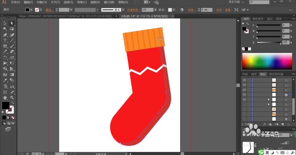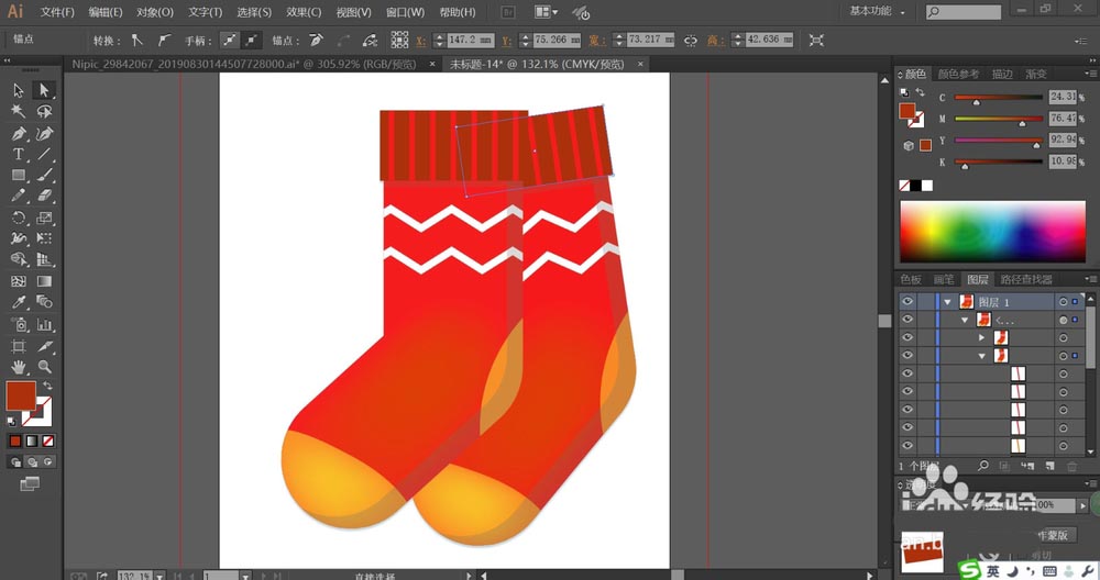 7、最后,我们还可以尝试别的配色方案,使用红棕色与红色搭配填充袜子的顶端竖线条纹区域,再通过网格工具做出棕色渐变与红色渐变搭配的效果,这样的袜子又是一种新的色彩风格。