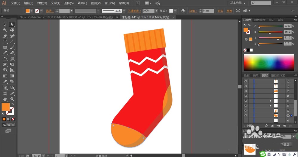 5、我们用同样的方法绘制出左侧的另外一只袜子,再选择网格工具给袜子的橙色跟部与脚尖部分做一下橙色的渐变效果。