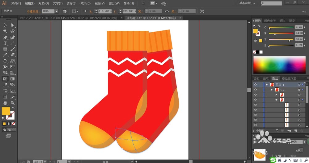 6、我们继续使用网格工具给袜子的红色部分做一下红色的渐变效果,从而完成毛线袜图片设计。