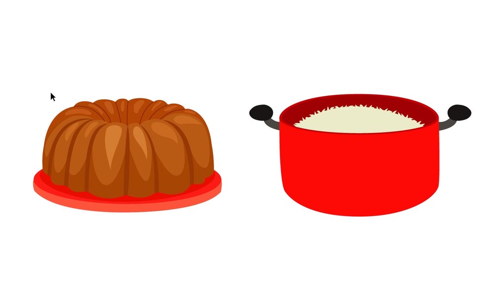3、继续复制圆形的铁锅顶端形状缩小到90%,再填充更暗的红色,让铁锅的边缘与内部有着明显的色彩变化。使用钢笔画出米饭所在的圆弧形状并填充灰白色。