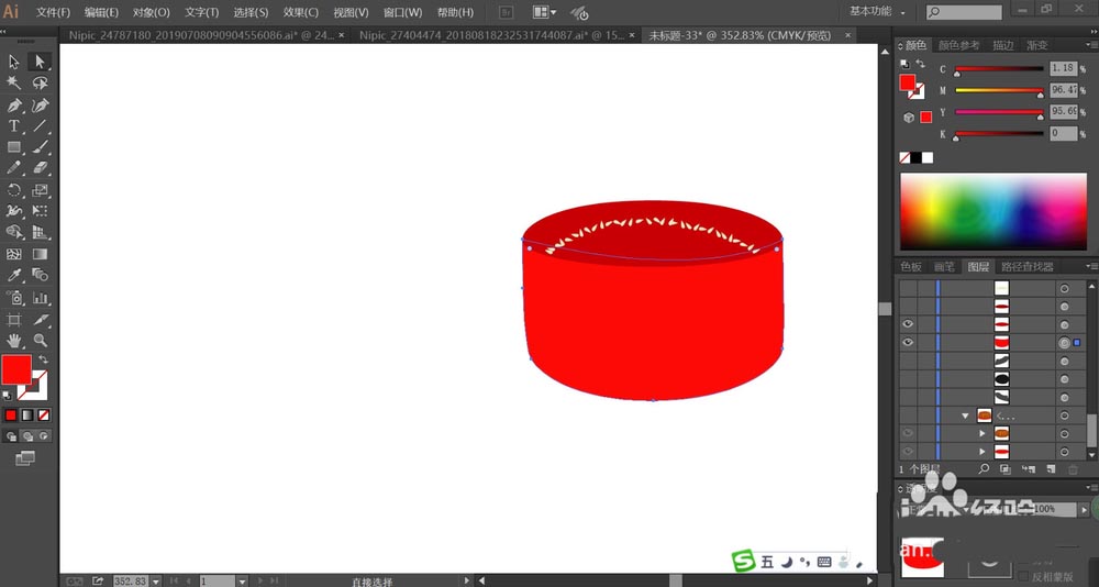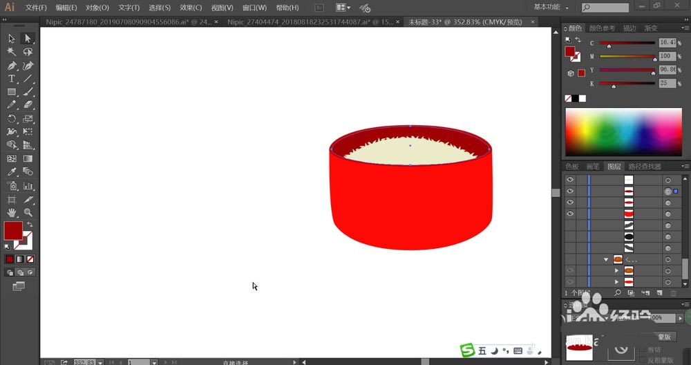 5、接着,我们使用圆形工具画出左侧的餐盘的结构,分别用大红色与红色填充正面与底部,让其结构层次呈现出来。