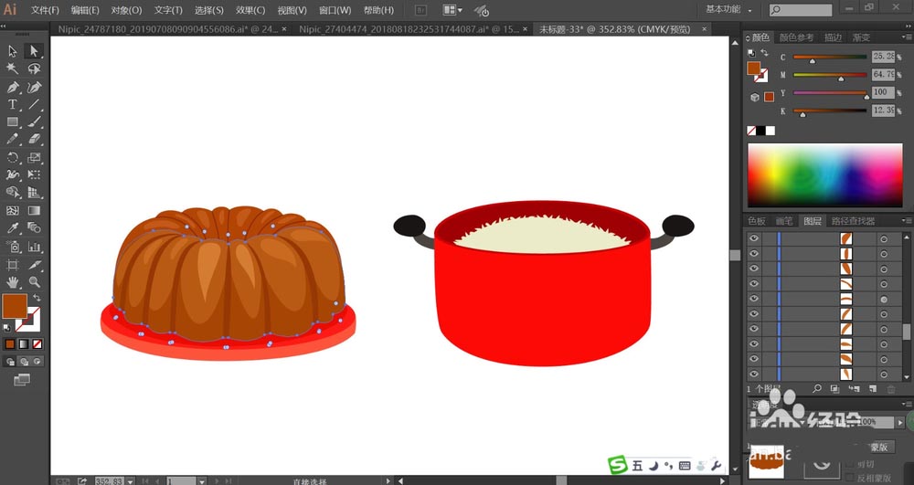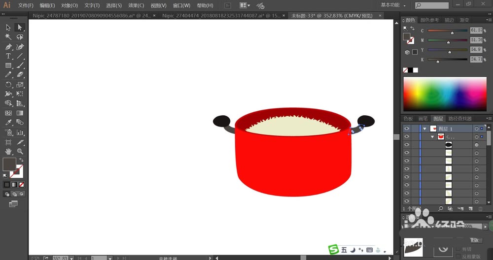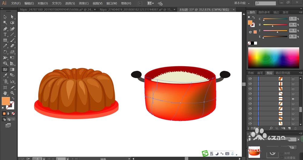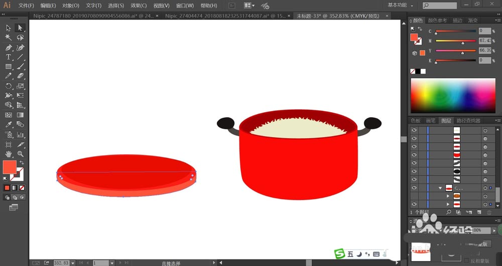 7、最后,我们用网格工具给铁锅做一下渐变效果,让铁锅的正面呈现红白、红黄、红橙等多种色调的渐变,再给铁锅两侧的手柄做一下灰白色的渐变效果,从而让金属材质呈现在手柄上面,完成饭菜图片设计。