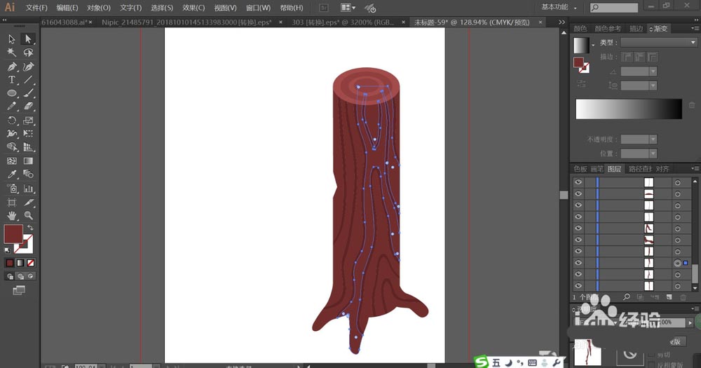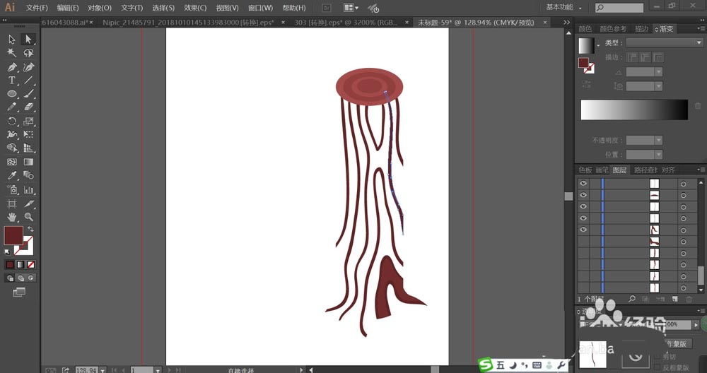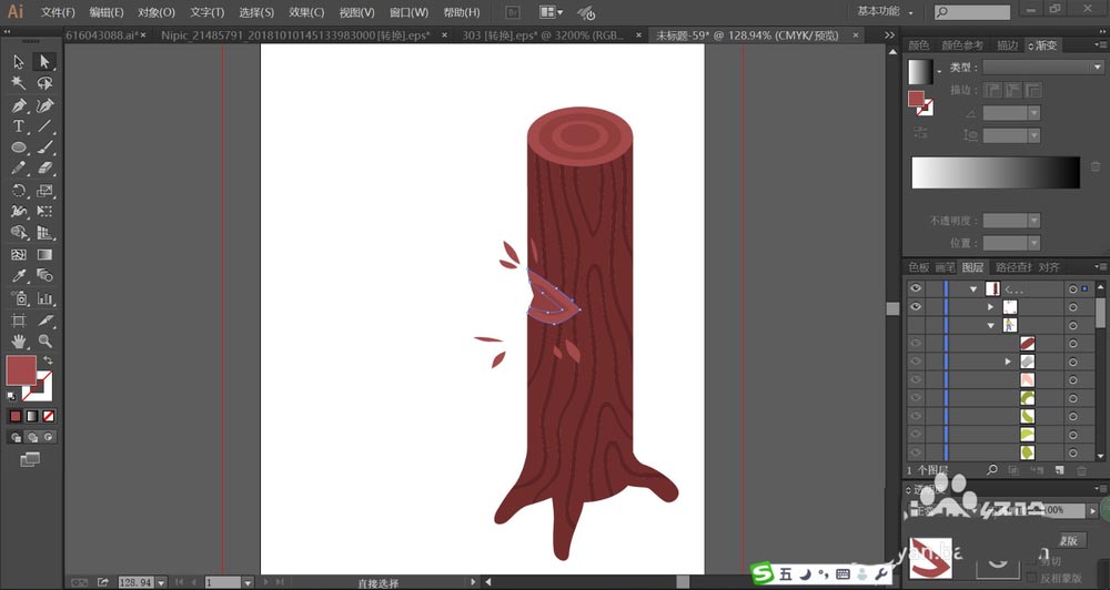 1、使用钢笔工具画出工人的手臂与斧头的路径,再画出树木的细节元素,重点包括顶端的截面与正面的条纹。