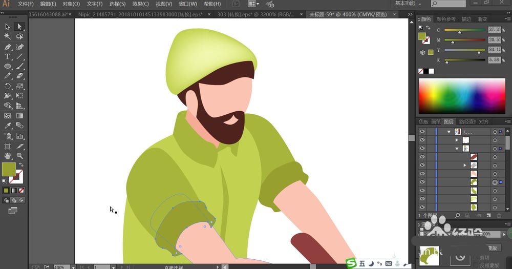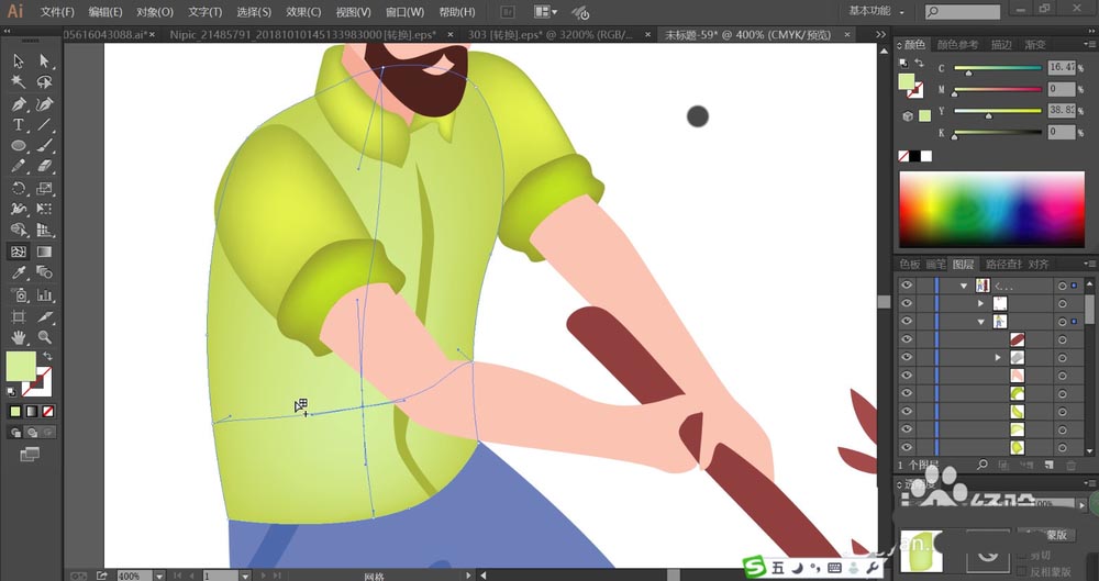 5、我们使用网格工具点击一下帽子,设置出绿色的渐变效果。再用三种不同的绿色分别填充工人的上衣、衣领、袖口。手臂用粉红色填充。