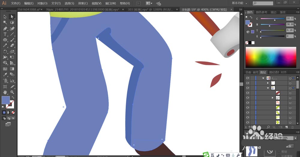 7、这一步,我们画出工人手中的斧头,再用红过色与灰色分别填充手柄与金属头,然后使用网格工具给金属头做出灰白色的渐变与灰色的渐变,让金属的质感呈现出来。