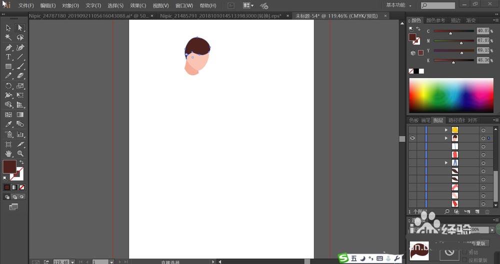 2、用红棕色填充工人的头发,用粉红色填充面部的皮肤,脖子的色调稍暗一些。