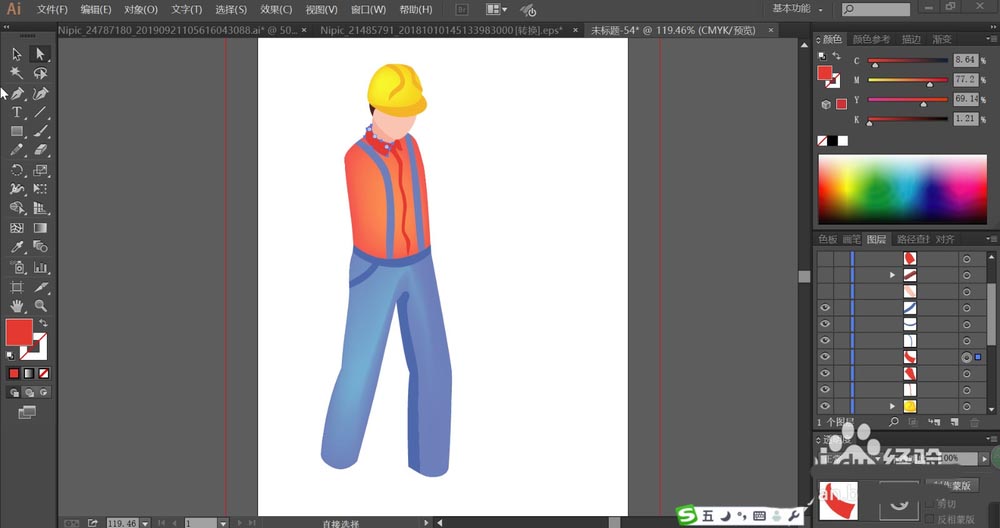 4、用蓝色填充工人的裤子,我们使用网格工具点击一下工人的帽子,做出橙黄色的渐变效果,点击一下工人的上衣做出红色的渐变,点击一下工人的裤子做出蓝色的渐变。
