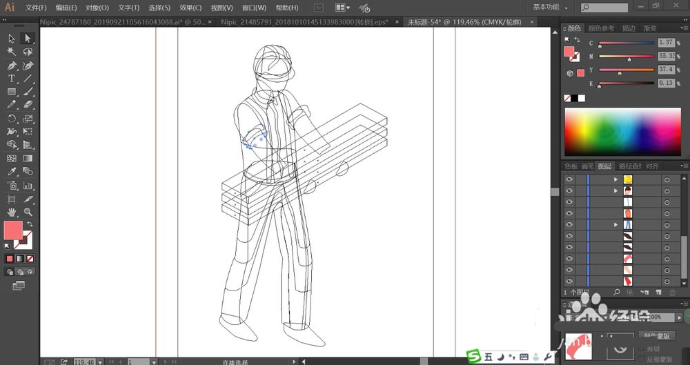 5、这一步,我们继续画出工人的手臂与手里的木块,绘制出木块的立体结构,通过三个侧面来呈现木块的顶端、左右侧面的细节,绘制完成一片木块再复制出其它的。