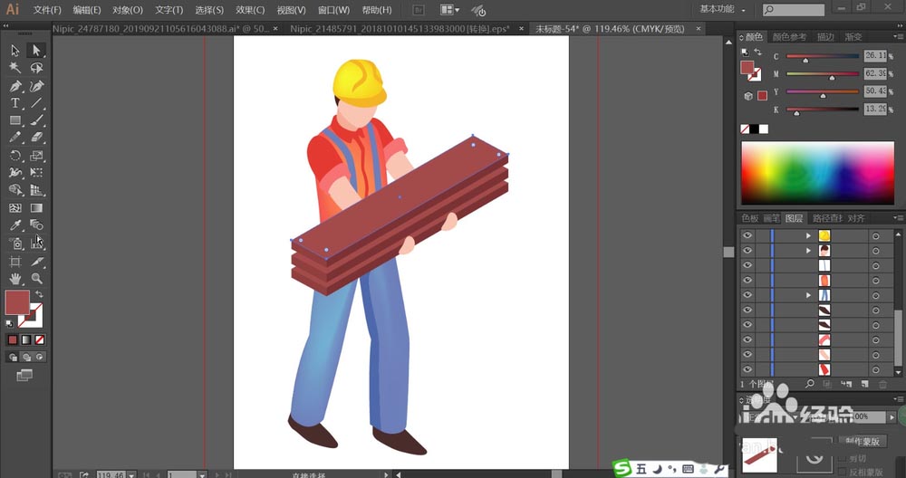 7、最后,我们用红棕色填充工人的鞋子,再使用网格工具点击一下木块的顶端做出红棕色的渐变,点击一下工人的皮鞋做出黄棕色的渐变,完成搬运工形象设计。