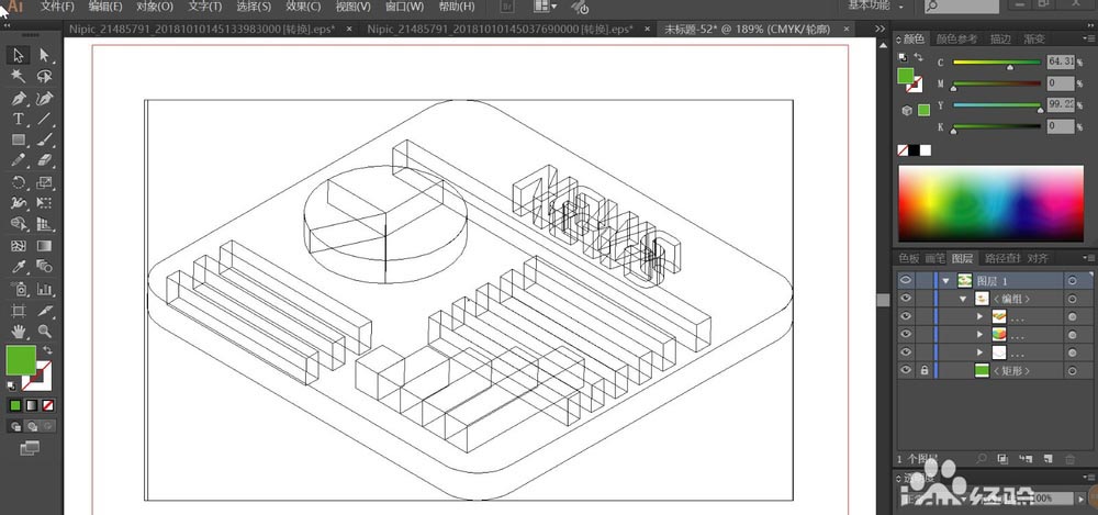 2、用草绿色填充背景,再用灰白色与灰色搭配填充平面的顶端与侧面,文字与线条用绿色填充。