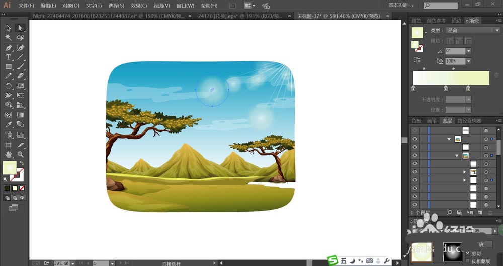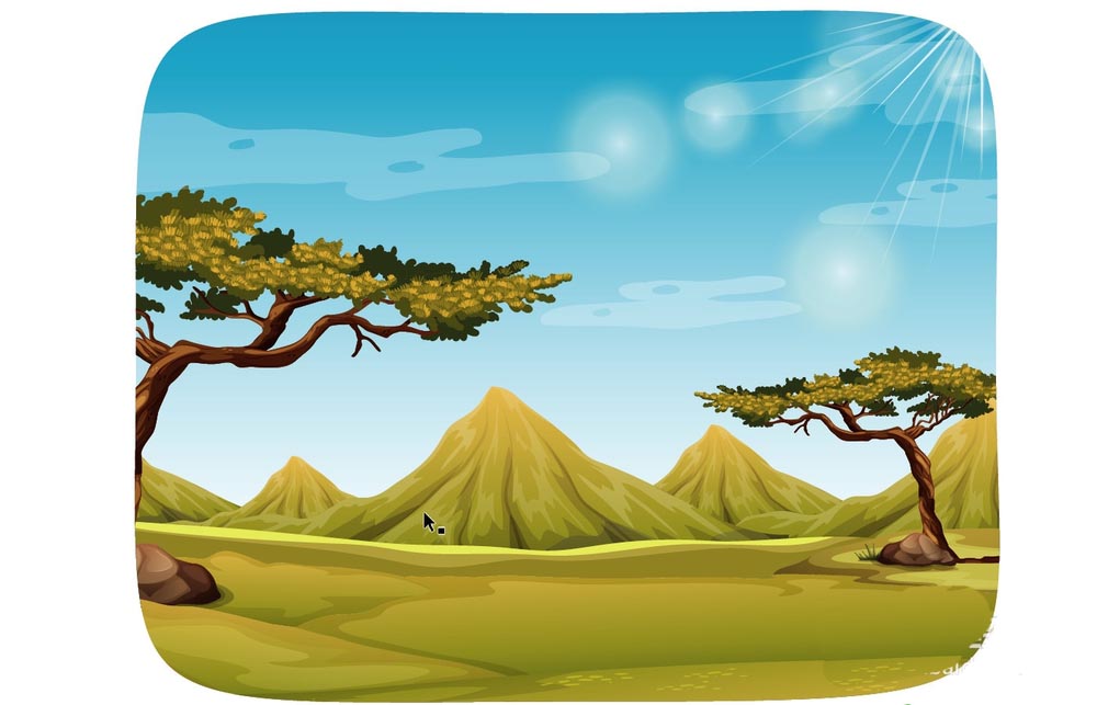 6、接着,我们再画出近处的草地,用黄绿色的渐变填充草地不同的区域,让其色彩有着丰富的层次,在远处用同样的方法绘制出松树与石头,让其保持较小的外形,符合近大远小的特征。