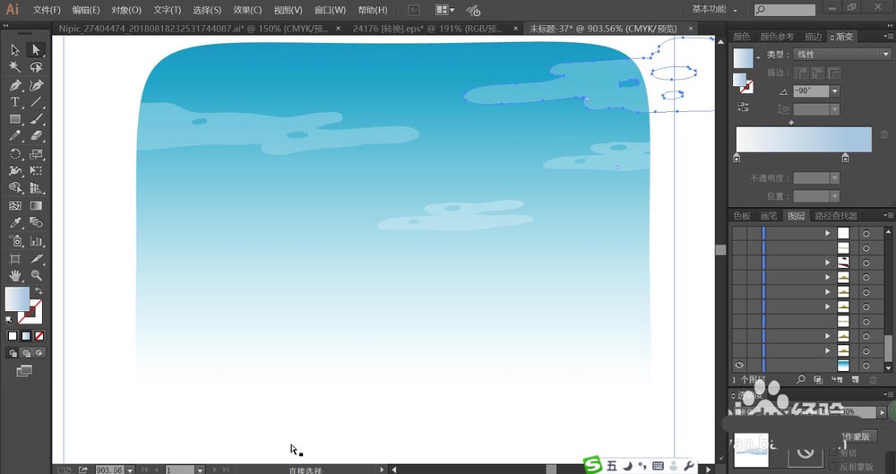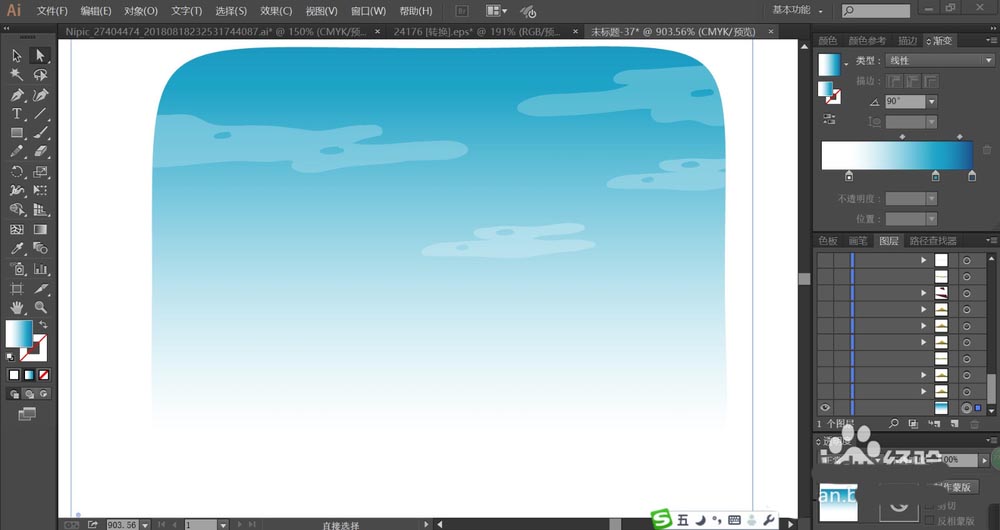 1、使用矩形画出天空的形状轮廓,再用蓝白色的渐变填充,绘制出云朵的形状再用天蓝色的渐变填充,设置成滤色模式,透明度为30%