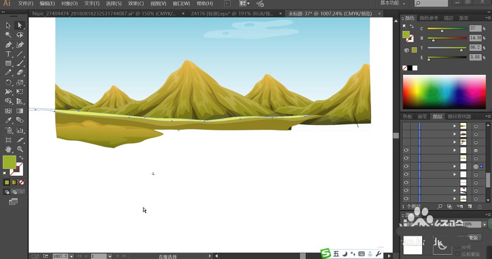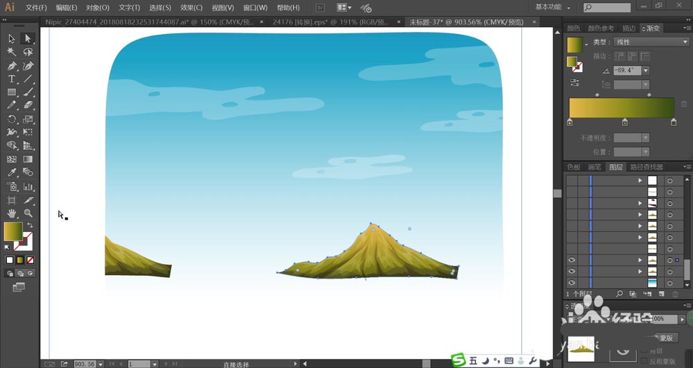 3、复制这些山峰并改变大小分布到背景当中的左侧、中间、右侧。接着,我们再来画一画草地,先用黄绿色填充草地,再分别填充草地的暗光与高光区域,设置成滤色与正片叠底模式,透明度为50%