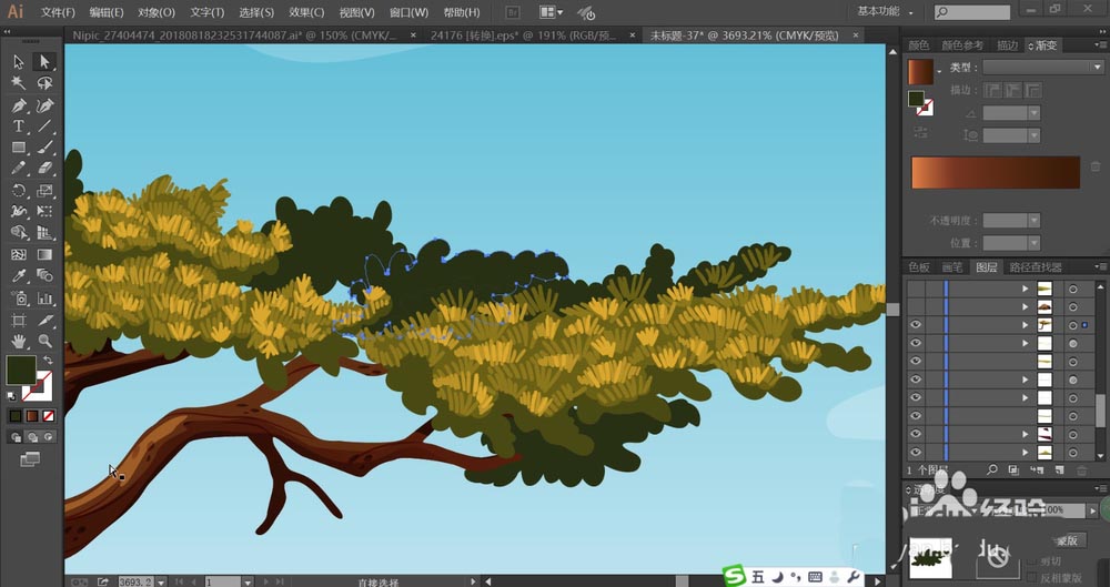 4、这一步,我们开始绘制松树,先用红棕色的渐变填充松树的轮廓,再分别做出暗光与高光效果,接着,我们用暗绿色、绿色、黄绿色分别填充松树的叶片,让其从明到暗分布在松树上面。