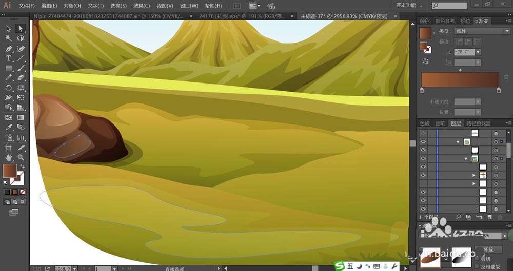 5、接着,我们继续用钢笔画出松树下方的石头,用不同明度的棕色填充石头的不同侧面,分别通过蒙版工具结合透明度的变化来呈现石头表面的复杂色彩变化。