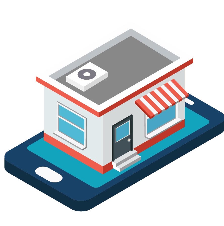 1、先用钢笔绘制出商店的基本轮廓,我们重点绘制出商店的小屋、窗户、小门与阶梯,还有屋顶的空调,下方手机的屏幕与侧面的简单轮廓。