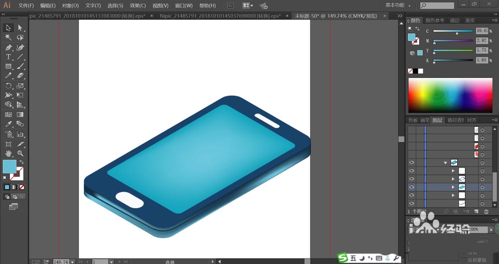 3、使用网格工具点击一下手机的屏幕玻璃做出蓝色的渐变效果,再点击一下手机的侧面做出蓝黑色的渐变效果,让金属与玻璃的材质呈现在手机上。