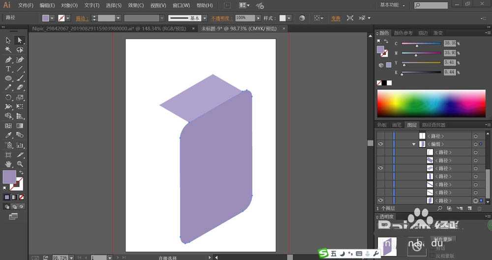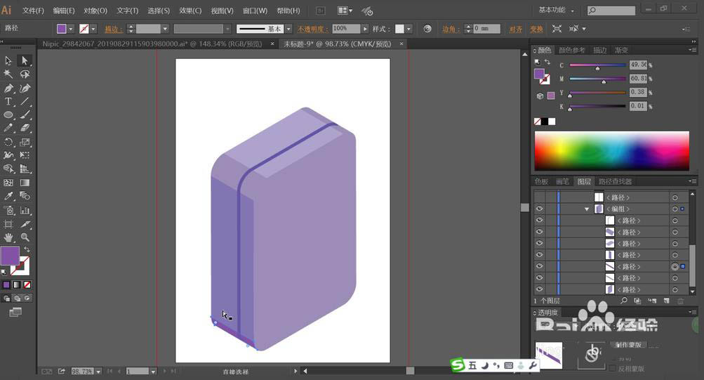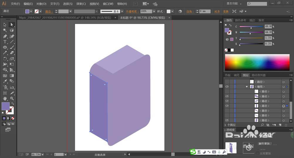 2、我们用三种不同明度的蓝紫色填充箱体的三个侧面,让其呈现一个立体的感觉。