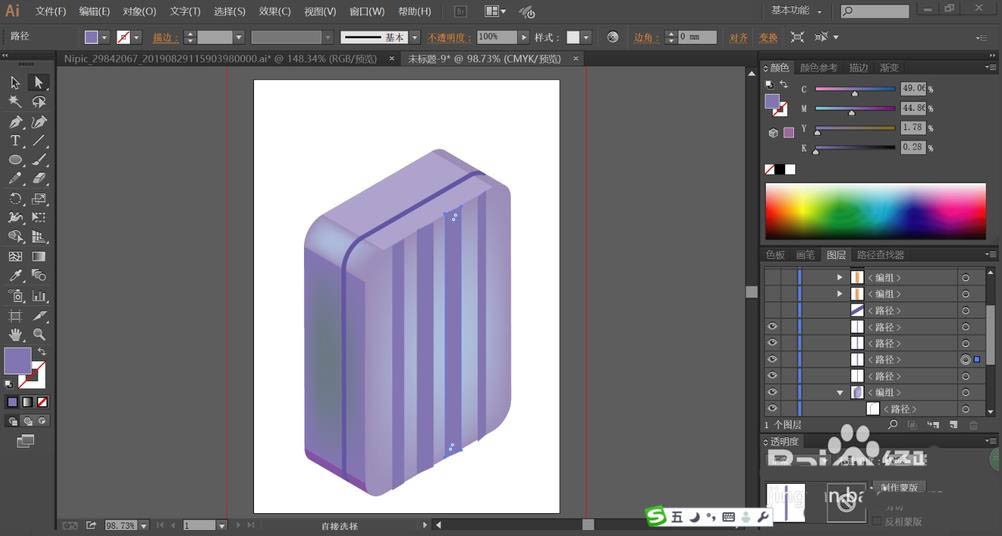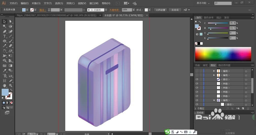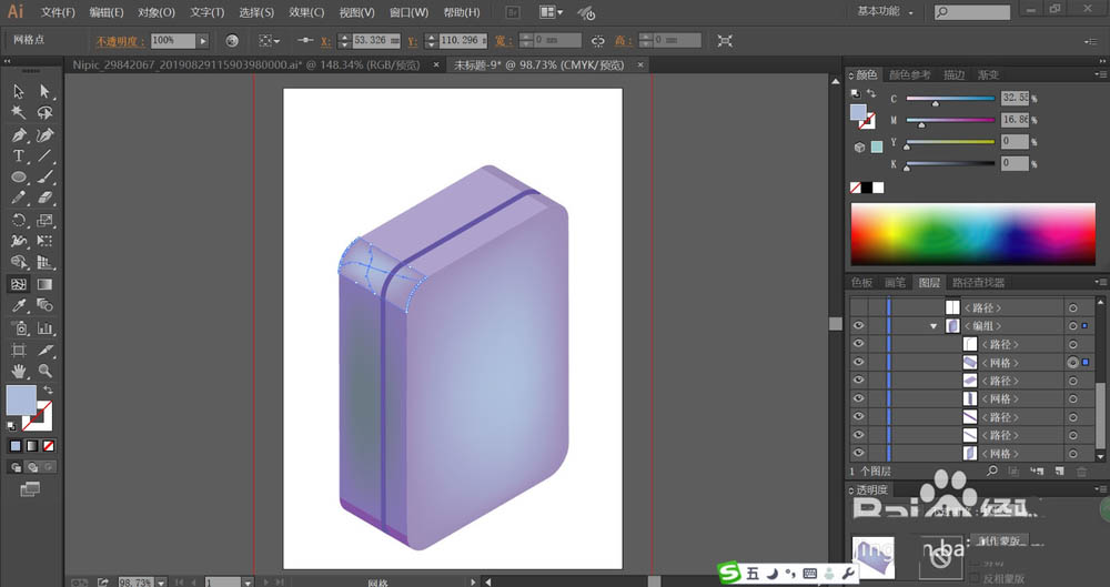 5、这一步,我们使用圆角矩形画出箱体右侧面的三道条纹并用暗蓝紫色填充,再分别用网格工具做出粉紫色与蓝紫色的渐变效果。