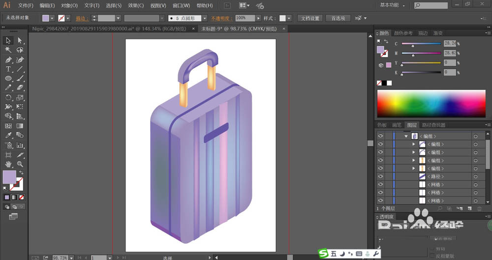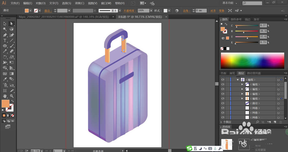 7、最后,我们再次使用网格工具给手柄的不同侧面做出蓝紫色的渐变效果,金属连接件也做出土黄色的渐变效果,完成拉杆箱图片设计。