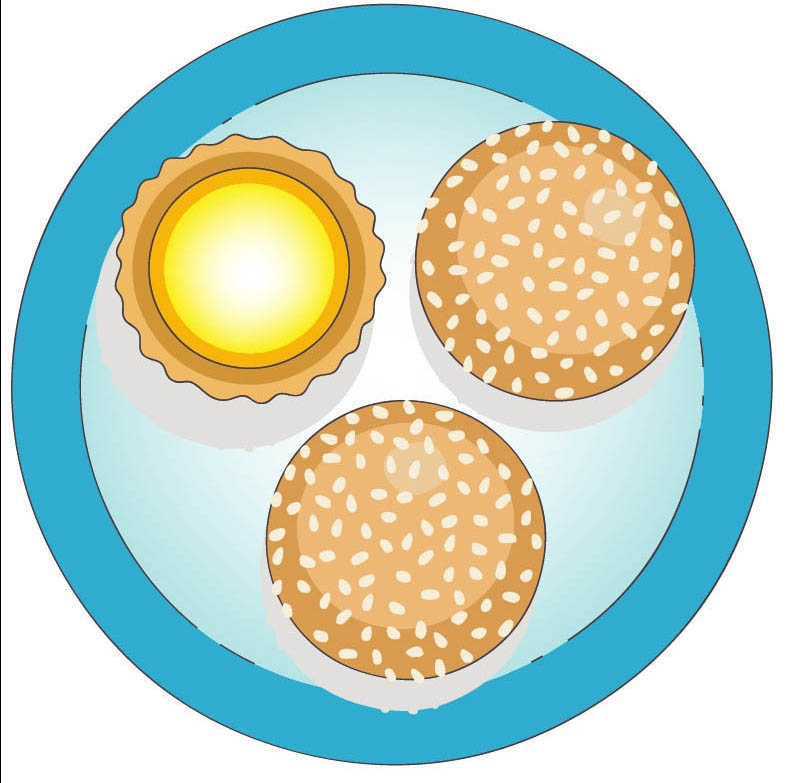 4、继续画出另外一只面包,再用圆形工具绘制出三个圆形的阴影在蛋糕与面包的右下方并填充灰色。