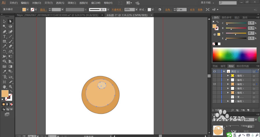 1、使用圆形工具画出餐盆、蛋糕与面包的主体形状,再用钢笔把餐盆的内外层结构绘制出来。