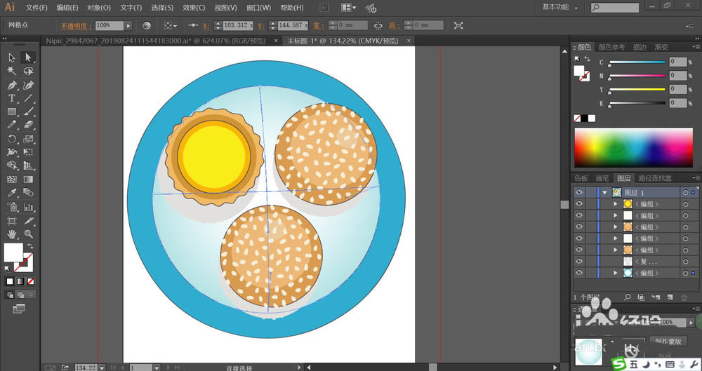7、最后,我们再用网格工具来做一下效果,先用蓝色与天蓝色分别填充餐盘,在餐盘的中间用网格工具点击一下让其成为天蓝色的渐变,再用网格工具点击一下蛋糕的表面,让其成为黄色的渐变,完成蛋糕盆的效果制作。