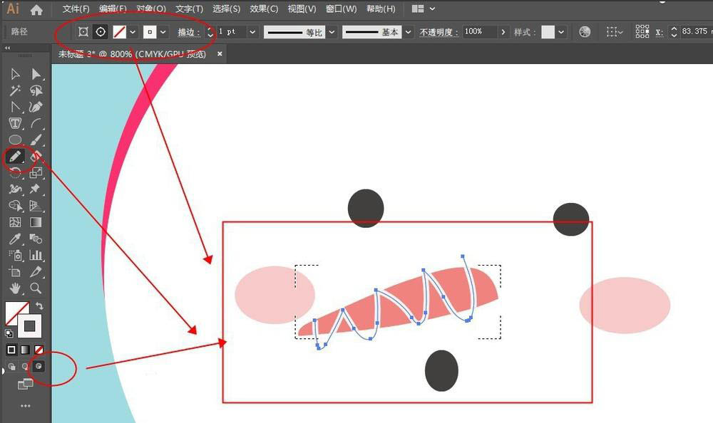 4、用铅笔工具给雪人画上鼻子,填充粉色。选中鼻子shift+x切换到内部绘图模式,用铅笔工具描边改为白色,在鼻子上画线条。