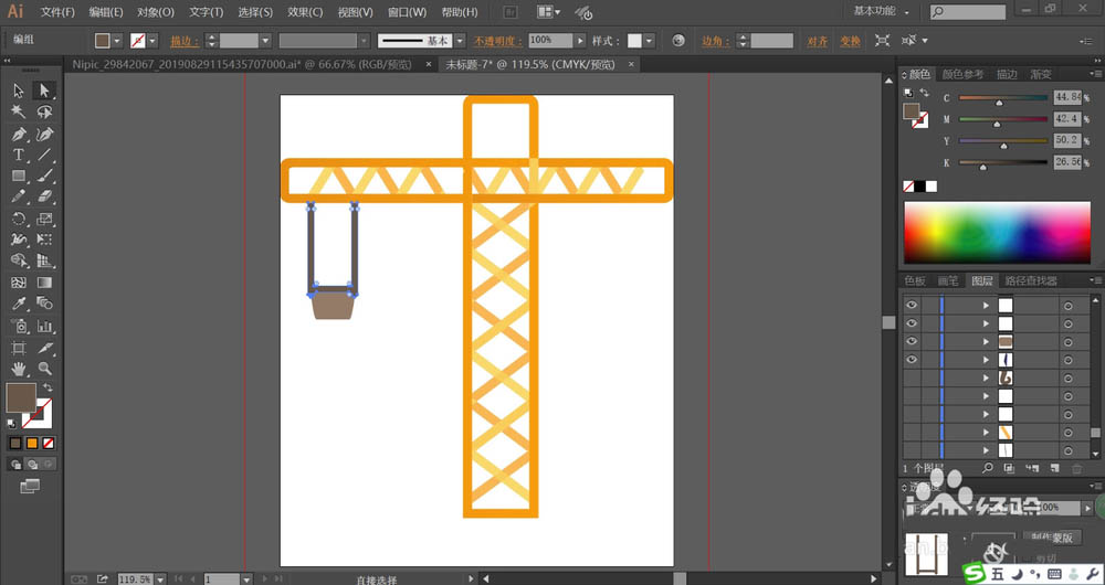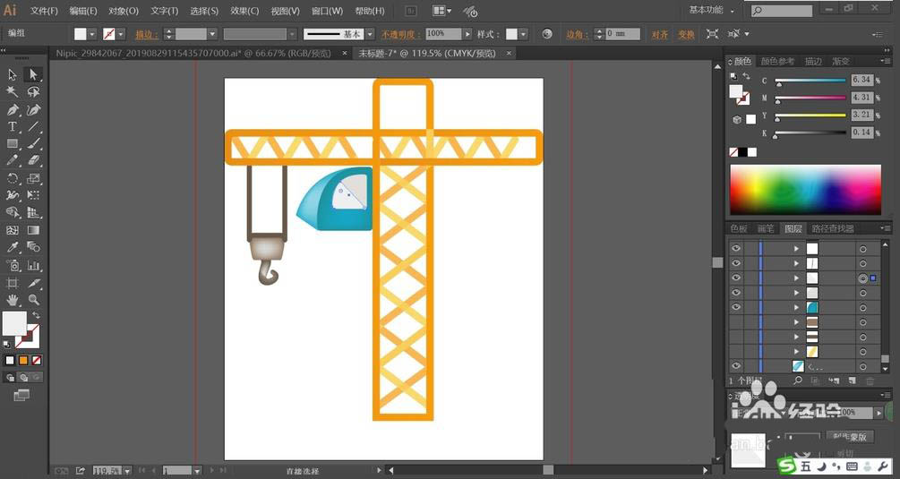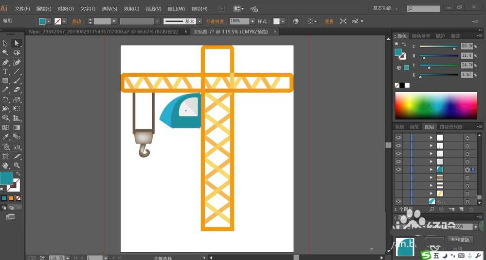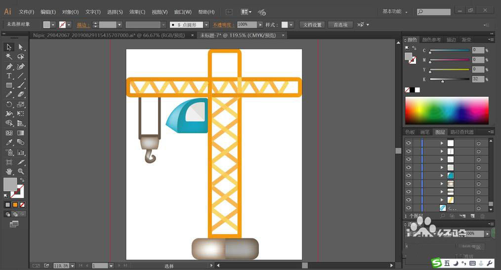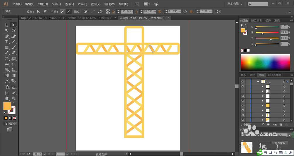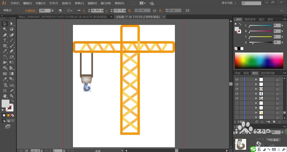 2、用橙黄色与桔黄色搭配填充吊车的支撑杆与里面的交叉结构件,让两种色彩交替出现在吊车支撑杆的内部。