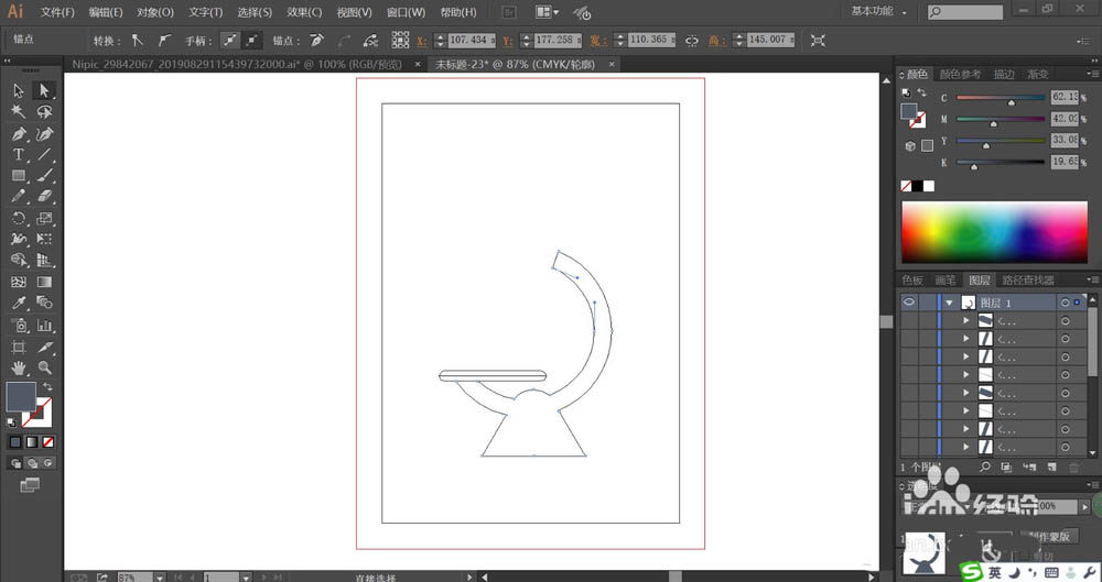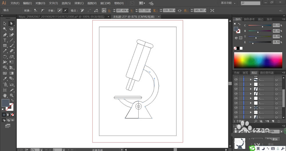 1、使用圆形工具画出圆环,再用剪切的方式成为半个圆环的路径,再用钢笔画出显微镜的基座,中间的圆形孔洞也绘制出来。