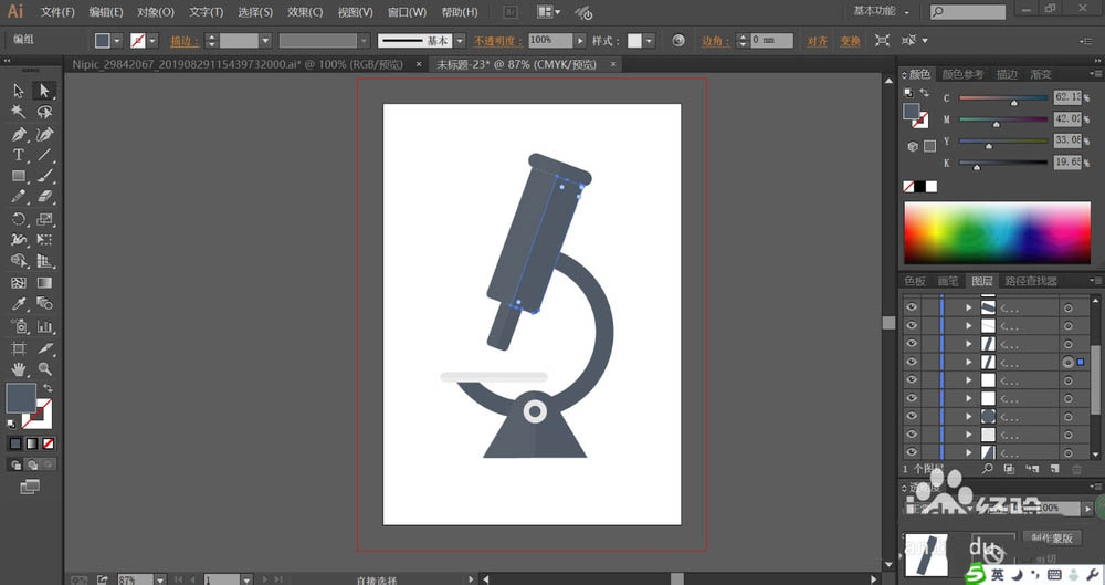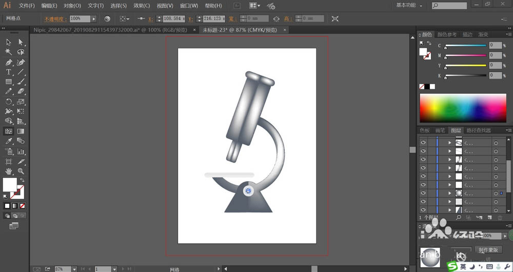 4、接着,我们再用网格工具点击一下镜筒与镜架,让其呈现灰黑色到灰白色的渐变效果,从而让金属的材质呈现出来,完成显微镜图片设计。