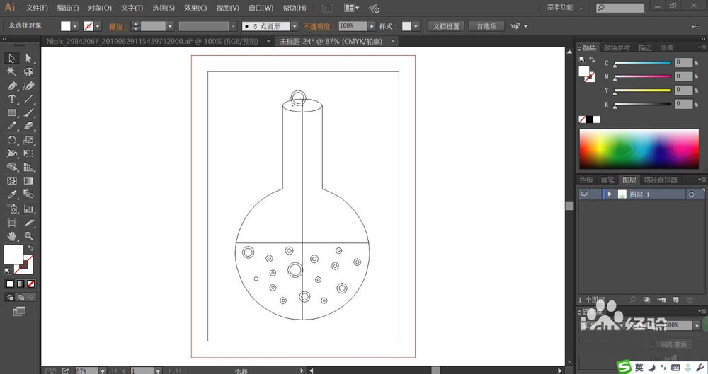 5、画完了显微镜,我们再来画一画烧瓶,使用圆形工具画出烧瓶的瓶口,再用钢笔画出瓶身,接着,我们用圆形工具画出烧瓶内的圆形气泡的路径。