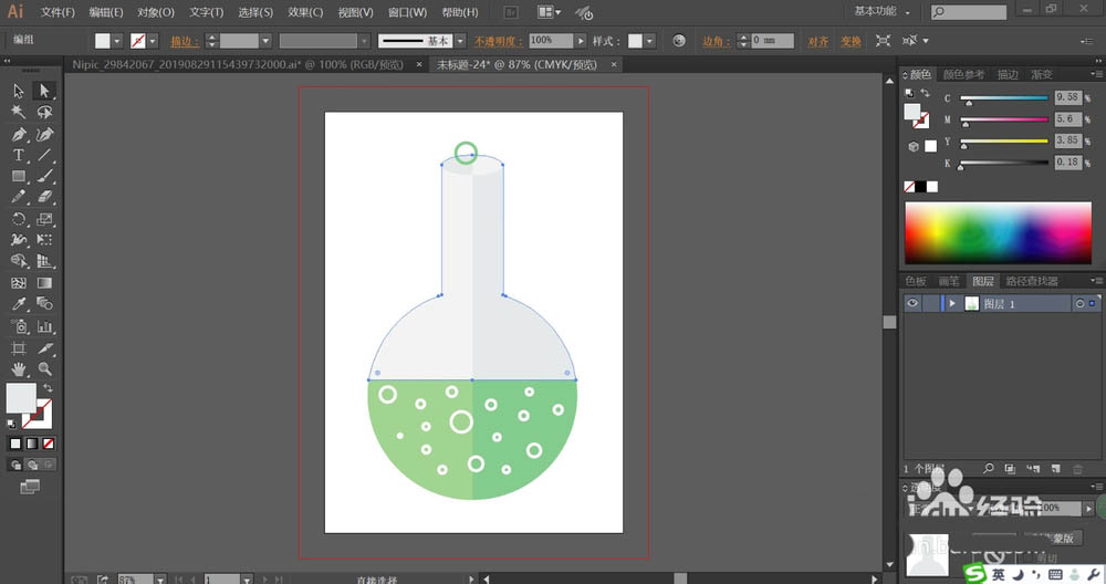 7、最后,我们用网格工具点击烧瓶的瓶身,还有绿色的液体,我们让这些元素呈现灰白色的渐变与绿白色的渐变效果,完成烧瓶图片设计。